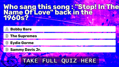 6/10 is the score to beat in this trivia quiz to put yourself over the average quiz taker. But you're probably going to be able to answer questions "Who sang this song : "Stop! In The Name Of Love" back in the 1960s?" and "Who sang this song : "Up On the Roof" back in the 1960s?" easy!